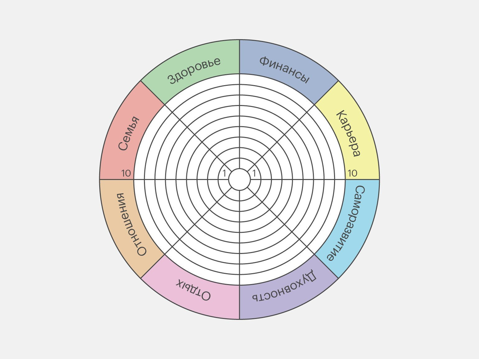 - Определите свои ценности. Без понимания жизненных приоритетов бывает трудно определить самое важное: на какой курс записаться, а какую покупку отложить. Чтобы не распылять свой фокус внимания на все и сразу, важно спросить себя: «Что для меня действительно важно?». Чтобы найти ответы, можно воспользоваться техникой «Колесо баланса». Оно наглядно помогает понять, какие сферы жизни в порядке, а какие — требуют внимания.