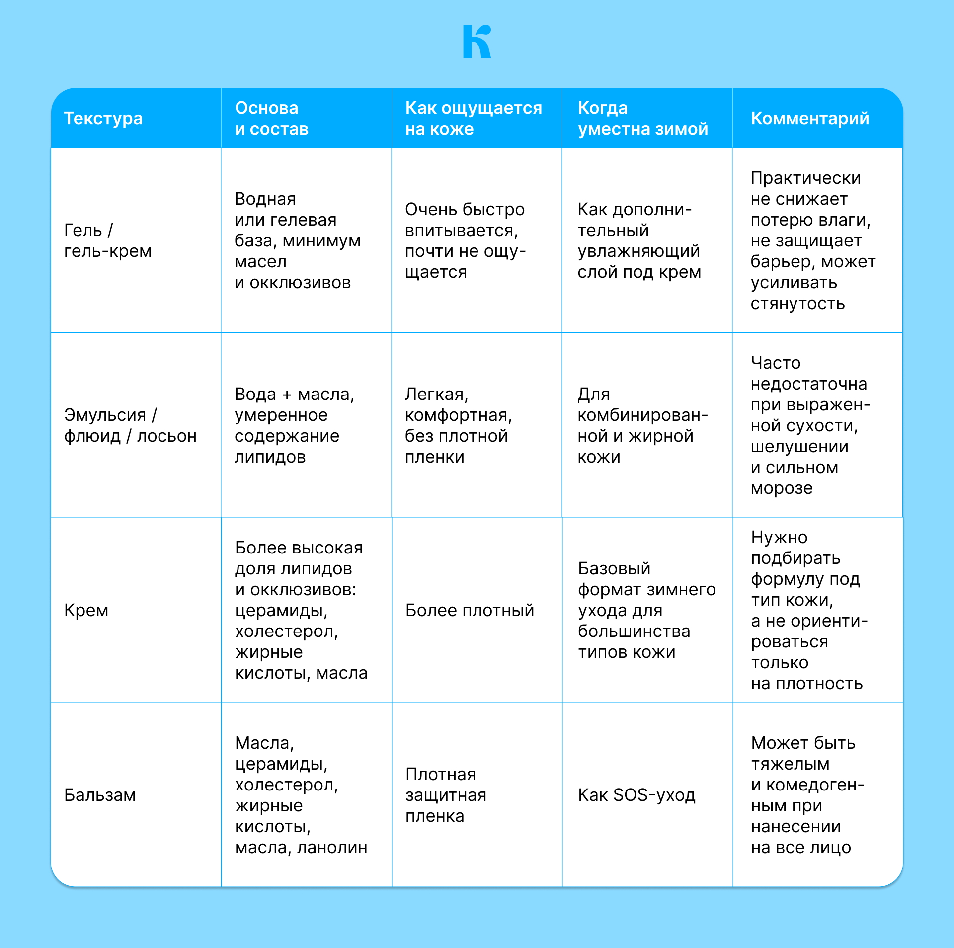 Почему легкие текстуры не работают зимой? Гели и ультралегкие флюиды преимущественно состоят из воды и содержат минимум липидов и окклюзивных компонентов. Летом этого достаточно: высокая влажность воздуха и активная работа сальных желез помогают коже удерживать влагу самостоятельно. Зимой ситуация обратная. В результате легкое средство: не формирует защитный липидный слой; не снижает испарение влаги; может даже усиливать ощущение стянутости на поврежденном барьере.
